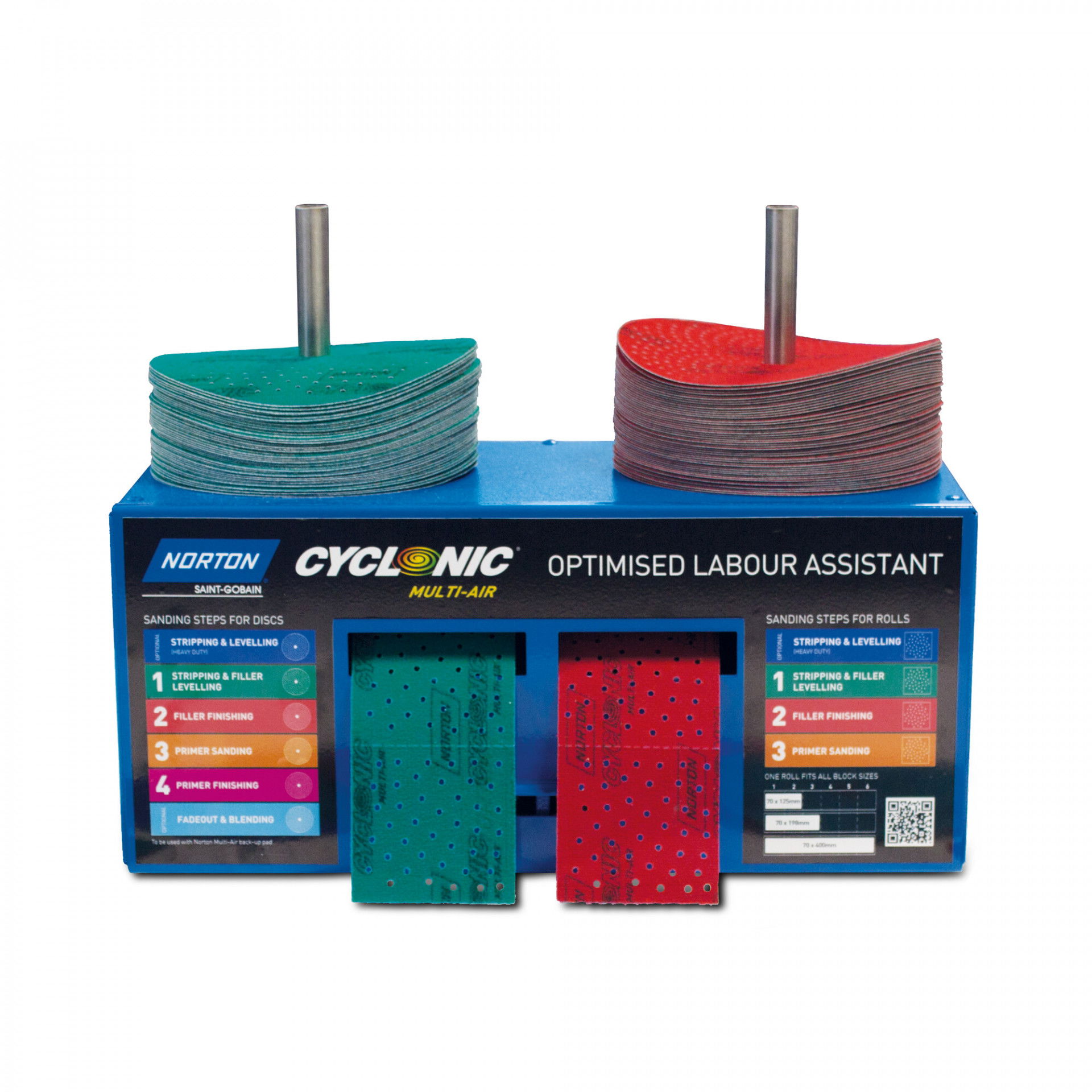 A Cyclonic Multi-Air A975 sorozatának ergonómikus adagolóját a csiszolókorongok és elővágott tekercsek kényelmes tárolására és felhasználására tervezték. Egyesíti a csiszolókorongokat, amelyeket az adagoló rugós rúdtartójának köszönhetően könnyen cserélheti, elegendő, ha a csiszológépet egyszerűen csak fentről rá nyomja a csiszolókoronra, és azonnal készen áll a munkára. A csiszolószalagok egy tekercsben helyezkednek el, amelyek bármilyen hosszúságú csiszológyaluhoz alkalmasak. Egy adagoló kétféle tárcsához alkalmas és 2 féle tekercs tárolható az adagoló belsejében. Az adagolók képesek kapcsolódni egymáshoz.