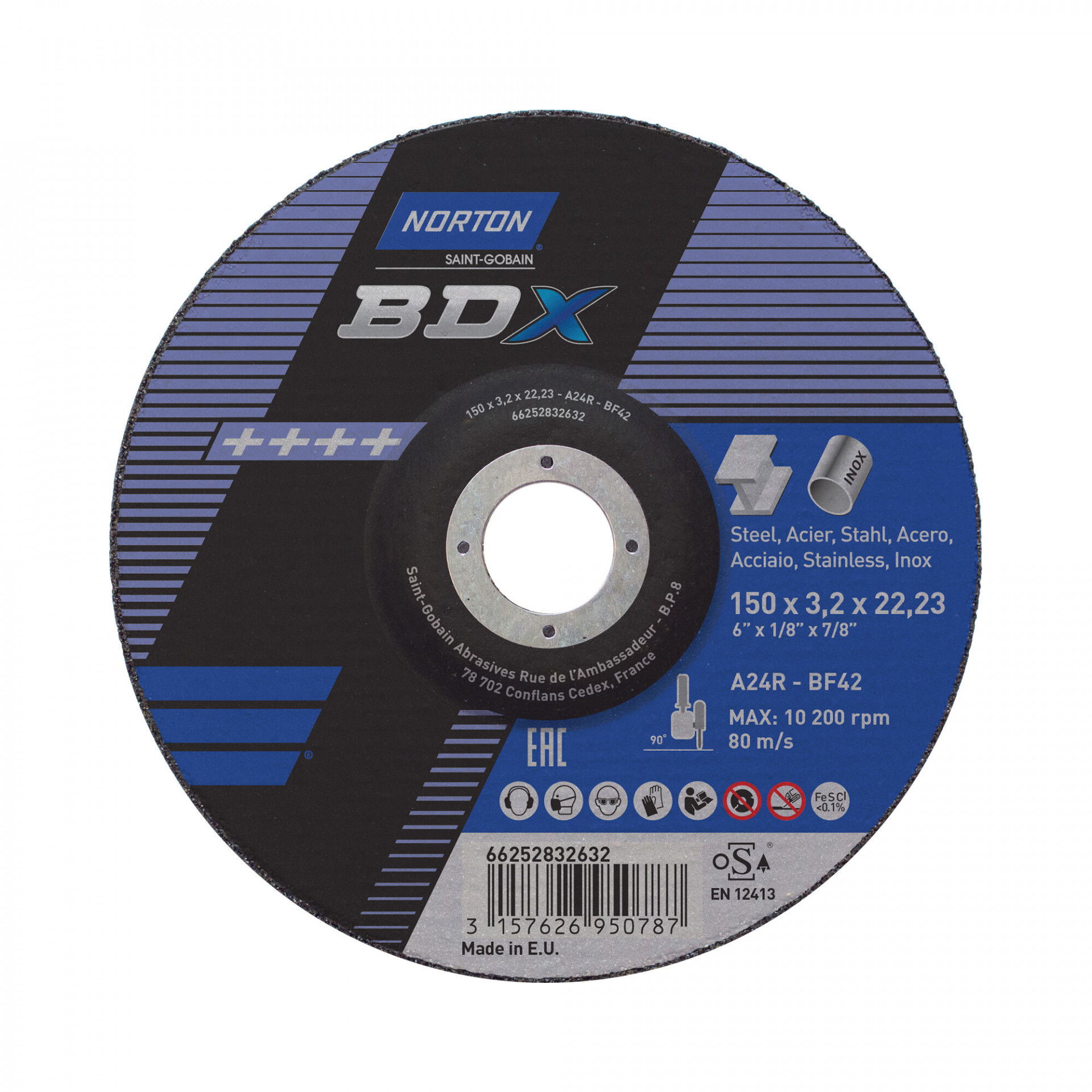 A Norton BDX fém-inox sorozat rendkívül vékony vágókorongokat kínál acél- és rozsdamentes acél széles választékához. A Norton BDX a költséghatékony vágókorongok szabványát állította be, amelyek hosszú élettartamot és gyorsabb fém eltávolítást biztosítanak az éles szilícium-karbid szemcséknek köszönhetően. Max.vágási sebesség : 80 m/s. Vas, kén és klór mentes. Nincs szennyeződés. Kevesebb rezgés.