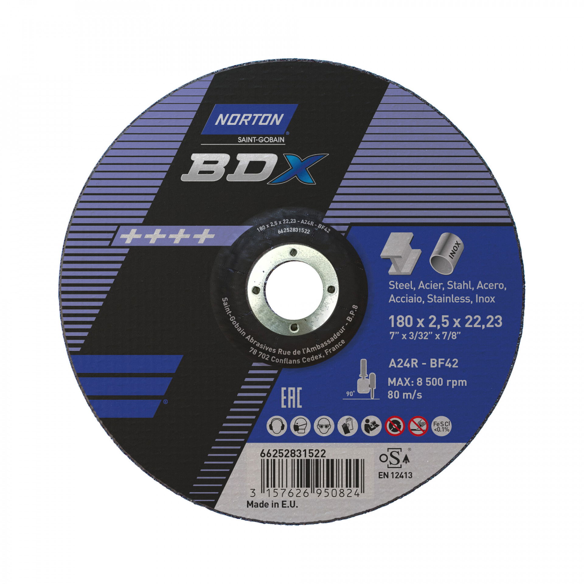 A Norton BDX fém-inox sorozat rendkívül vékony vágókorongokat kínál acél- és rozsdamentes acél széles választékához. A Norton BDX a költséghatékony vágókorongok szabványát állította be, amelyek hosszú élettartamot és gyorsabb fém eltávolítást biztosítanak az éles szilícium-karbid szemcséknek köszönhetően. Max.vágási sebesség : 80 m/s. Vas, kén és klór mentes. Nincs szennyeződés. Kevesebb rezgés.