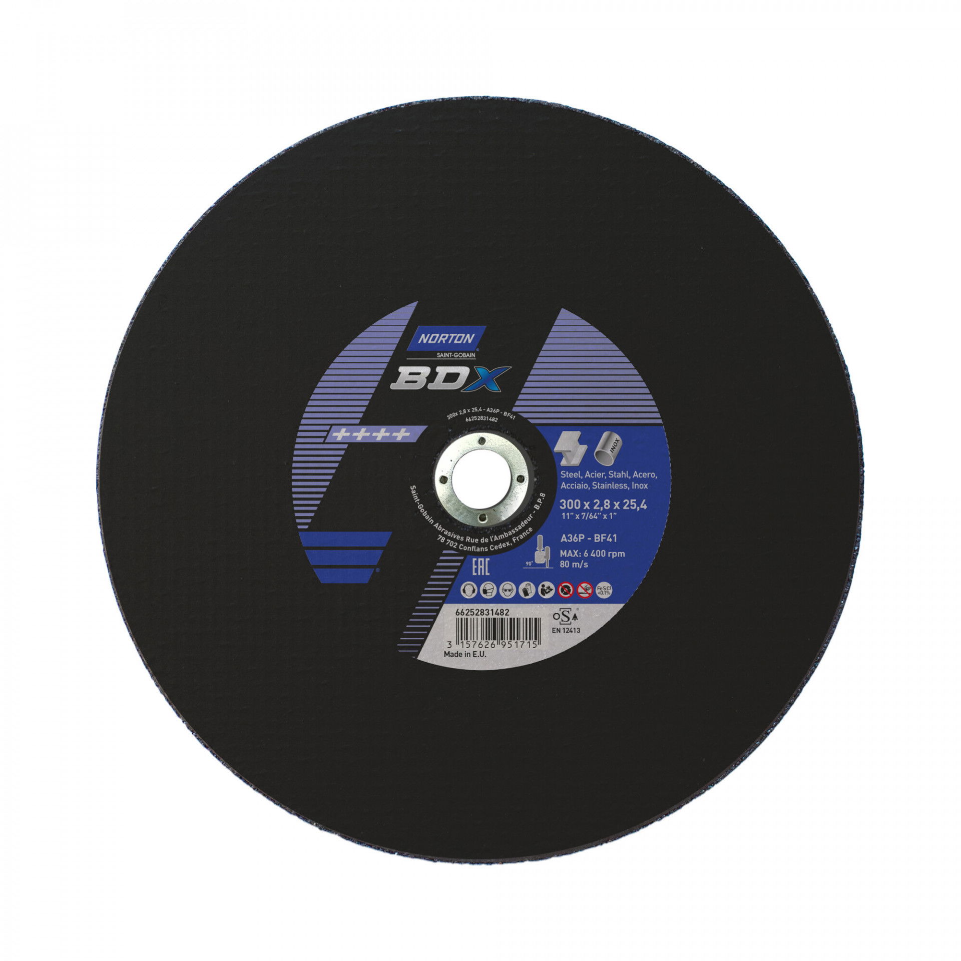 A Norton BDX fém-inox sorozat rendkívül vékony vágókorongokat kínál acél- és rozsdamentes acél széles választékához. A Norton BDX a költséghatékony vágókorongok szabványát állította be, amelyek hosszú élettartamot és gyorsabb fém eltávolítást biztosítanak az éles szilícium-karbid szemcséknek köszönhetően. Max.vágási sebesség : 80 m/s. Vas, kén és klór mentes. Nincs szennyeződés. Kevesebb rezgés. A vágókorongot kifejezetten kézi darabolókhoz tervezték.
