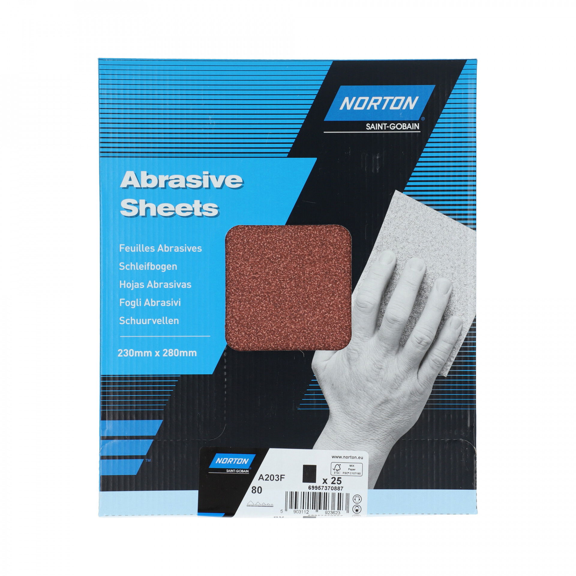 Norton Clipper A203F univerzális csiszolópapír minden fa csiszolásához. Alumínium-oxid szemcséjével és FSC® tanúsítvánnyal ez egy nagyon megfizethető lehetőség. Az FSC® tanúsítvány garantálja a felelős származást és a környezetbarátságot. Az alumínium-oxid szemcsék kiváló eredményt adnak fán, lakkon és vakolaton.